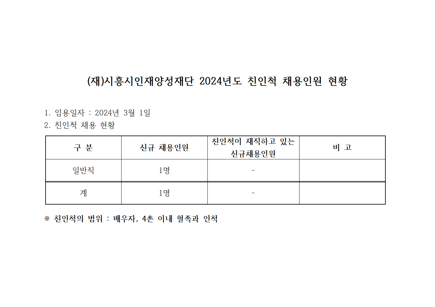 [친인척 채용인원 공개] 2024년 신규채용 관련 임직원 친인척 현황 공시(3월)
