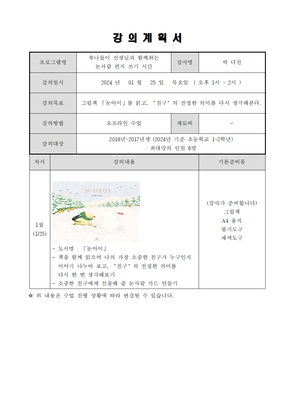 겨울방학 프로그램 - 북나들이 선생님과 함께하는 눈사람 편지쓰기 시간