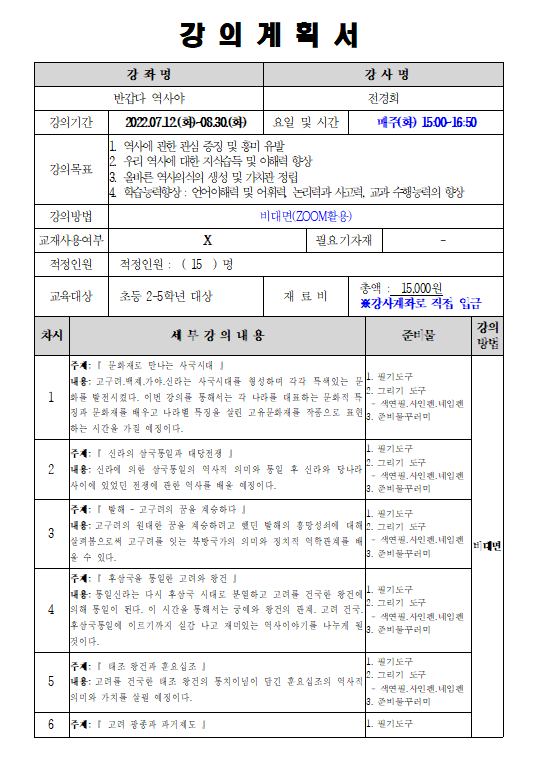 | 수강료 | 10,000 | 재료비 | 15,000원 |