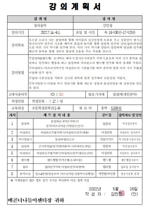 | 수강료 | 5,000 | 재료비 | 5,000원 |