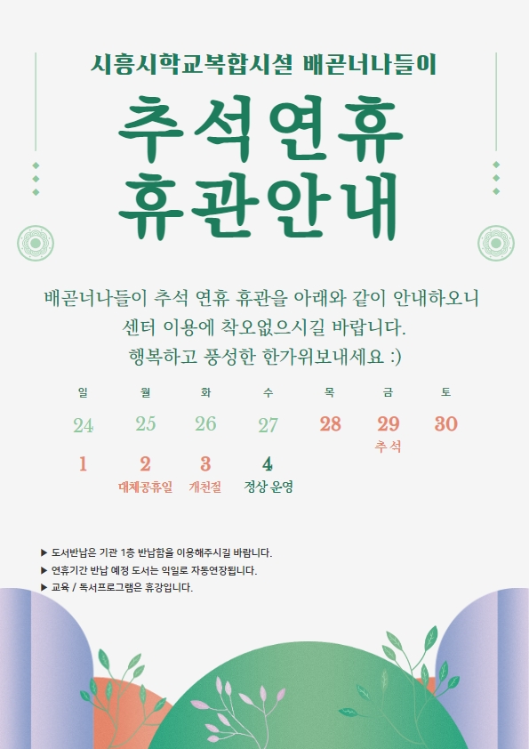 [공지] 배곧너나들이 법정공휴일(추석연휴, 개천절) 휴관 안내